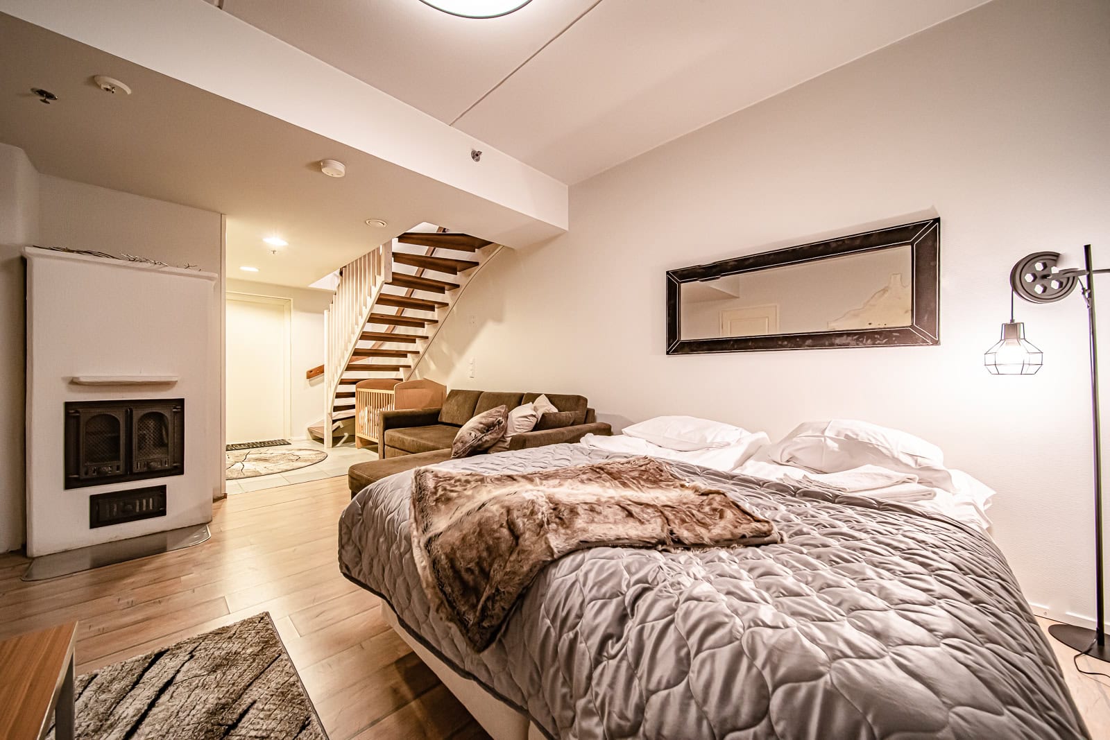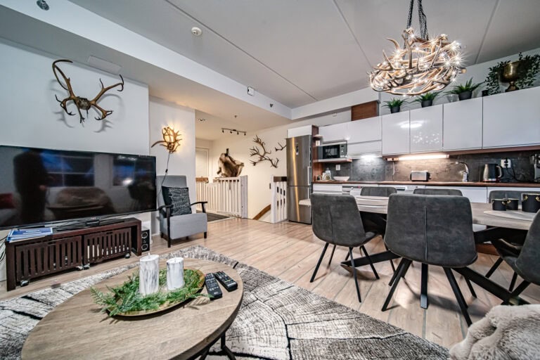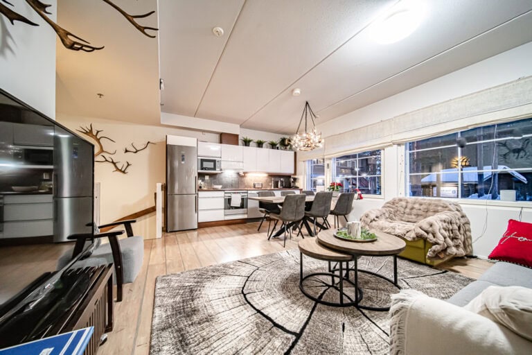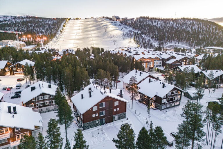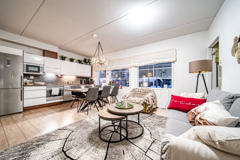 Levin keskustassa kaksikerroksinen lomahuoneisto, kahdella makuuhuoneella ja parvella.